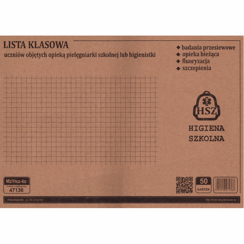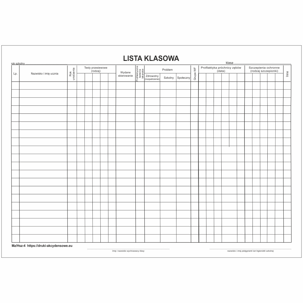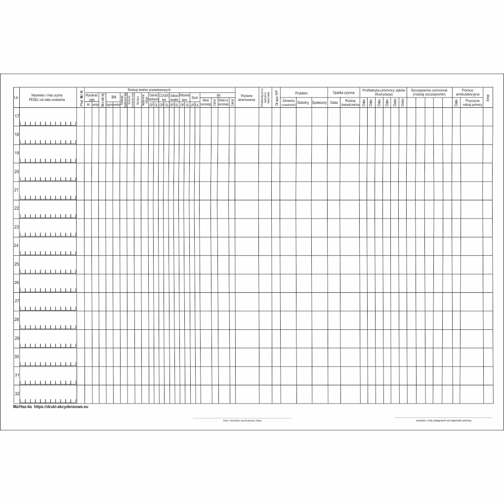 Mz/Hsz-4a (nr kat. 47136) - wersja rozszerzona, szersze rubryki, dodatkowe miejsce na PESEL dziecka, szczegółowe rubryki do badań przesiewowych, fluoryzacja i szczepienia. 1 kartka wystarcza na 32 wpisy (druk 2-stronny) po 16 osób na stronie