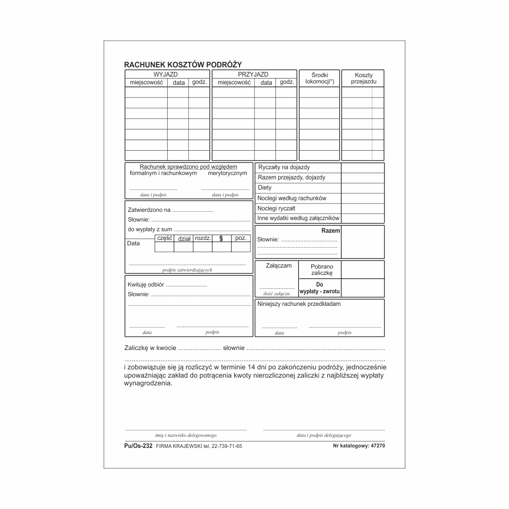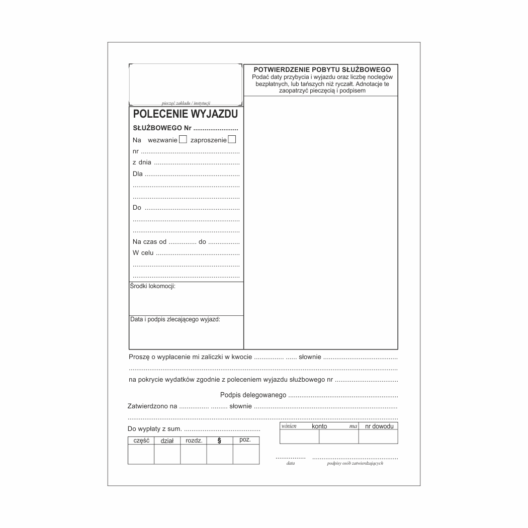 Nasz druk jest dedykowany dla jednostek budżetowych, organizacji oraz podmiotów prawnych i osób fizycznych prowadzących jednoosobową działalność gospodarczą. Druk służy do udokumentowania wyjazdu służbowego na terenie Polski. Zawiera miejsce na określenie czasu podróży, kosztów związanych z podróżą oraz co najważniejsze miejsce na poświadczenie - potwierdzenie pobytów służbowych w czasie podróży. Druk ten jest podstawą do rozliczenia kosztów podróży służbowej w księgowości. Brak takiego prawidłowo wypełnionego druku będzie skutkowało nieuznaniem przez kontrolę skarbową poniesionych kosztów podróży służbowej.