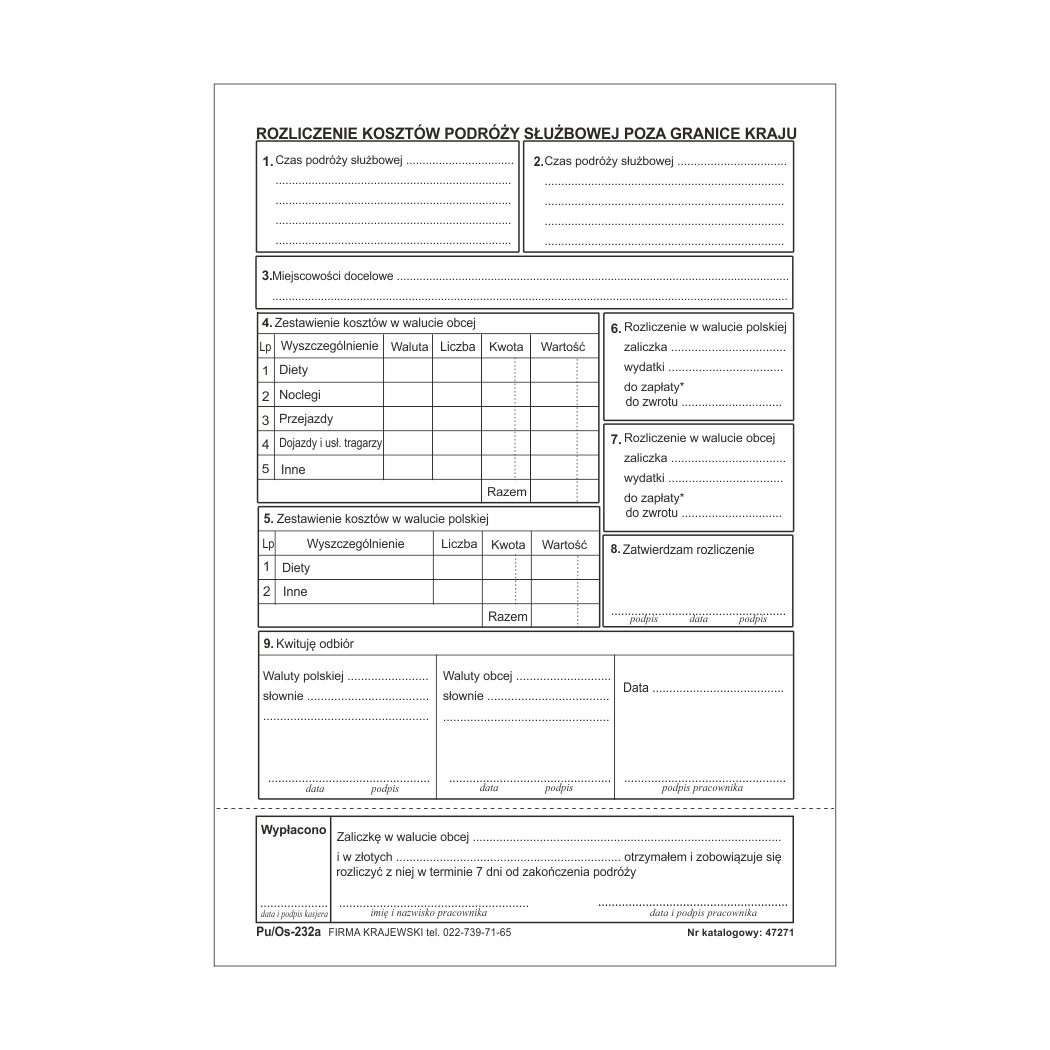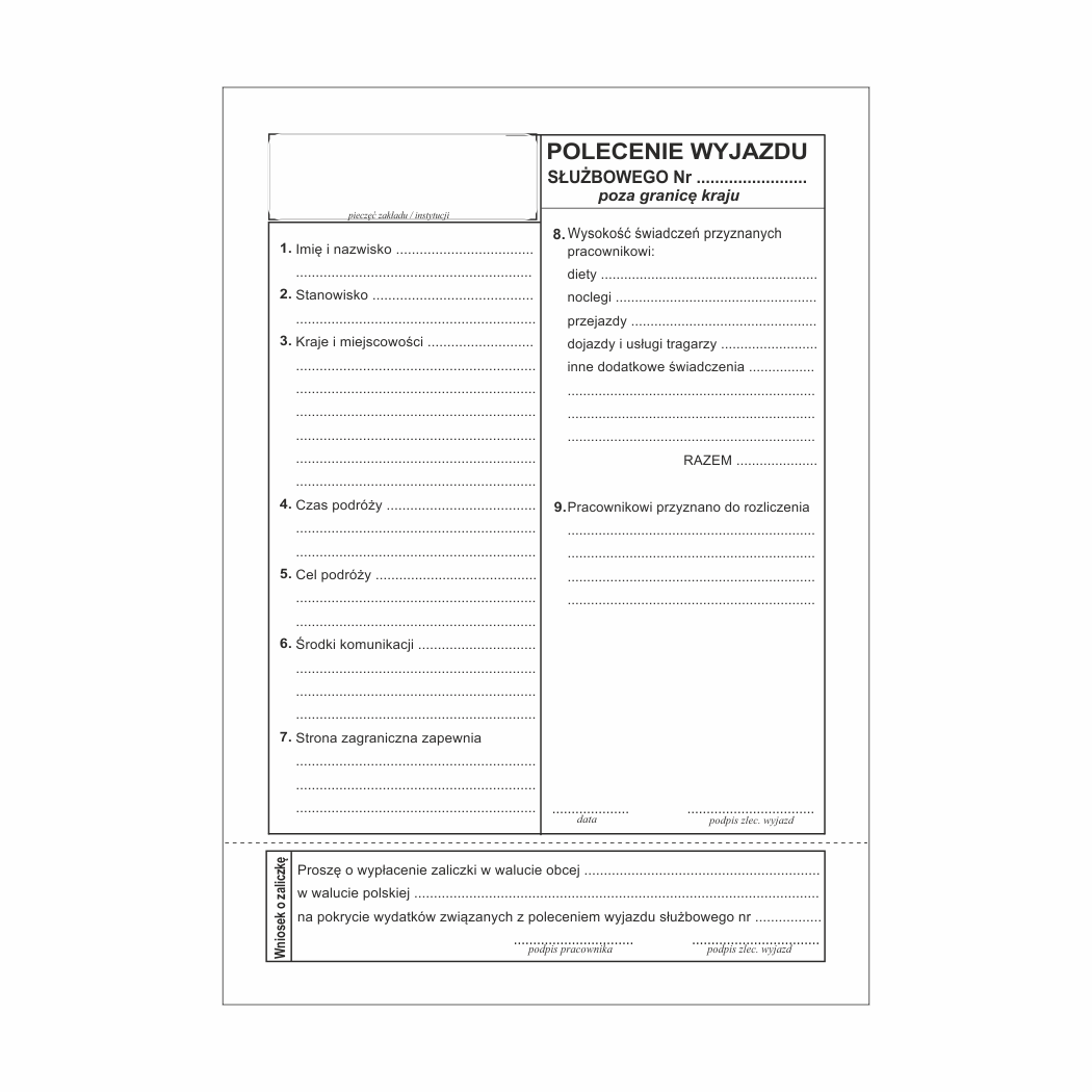 Druk stosuje się do udokumentowania przebiegu oraz kosztów podróży służbowej poza granicę kraju. Określa się w nim czas trwania takiej podróży oraz wyszczególnia poniesione koszty, co jest podstawą do naliczenia ekwiwalentu pieniężnego dla pracownika. Zastosowanie w jednostkach budżetowych oraz osobach prawnych i jednoosobowej działalności gospodarczej. Druk stanowi podstawę do wliczenia wydatków w koszty.