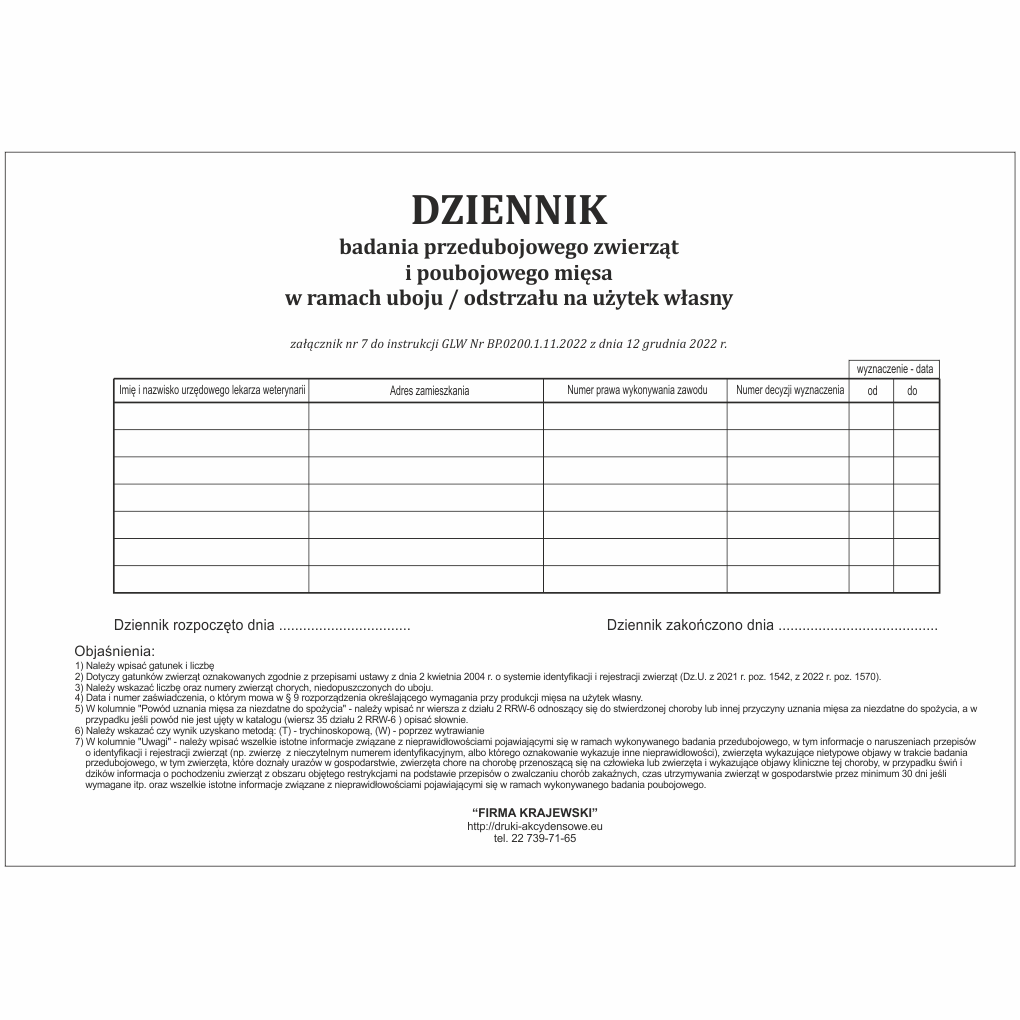 Dziennik badania przedubojowego zwierząt i poubojowego mięsa (GLW BP.0200.1.11.2022, zał. nr 7) [PIW-109]