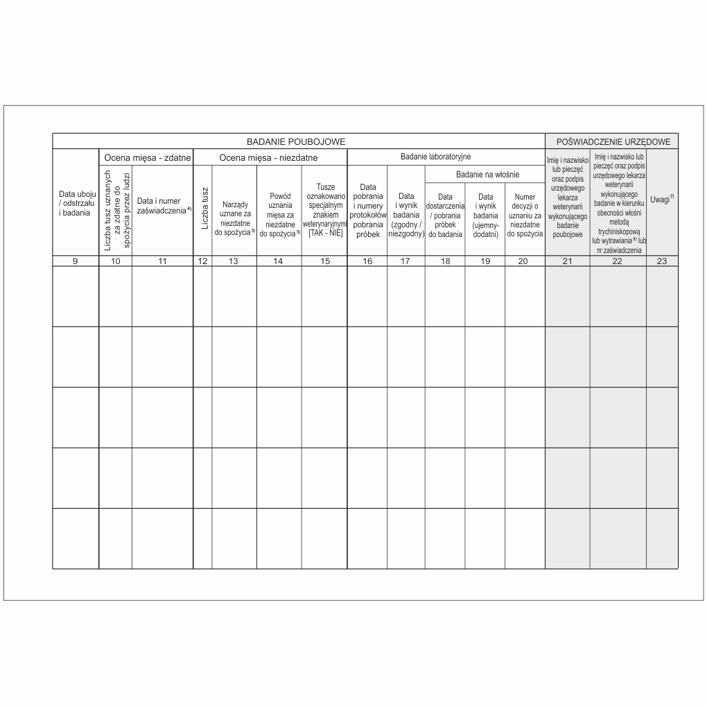 - Badanie poubojowe - badanie laboratoryjne - badania na włośnie - data i wynik badania (ujemny / dodatni)