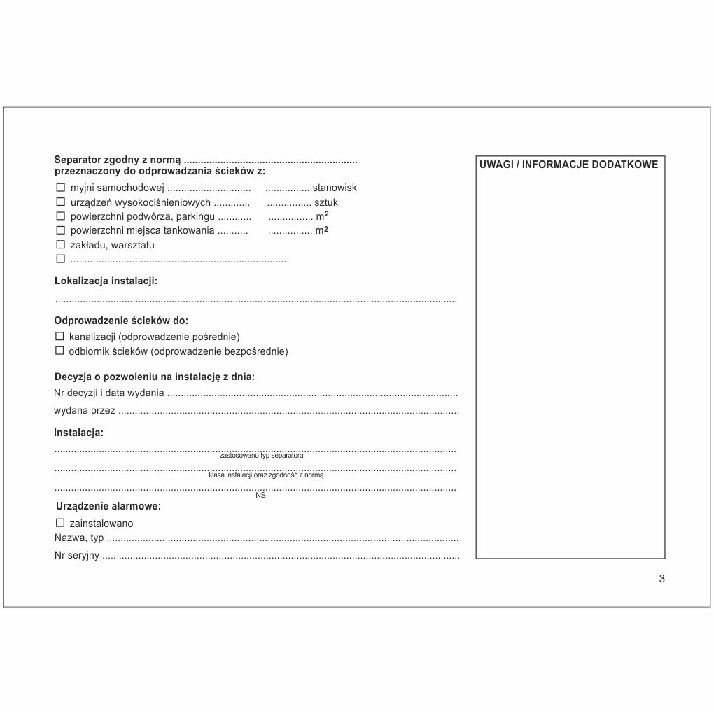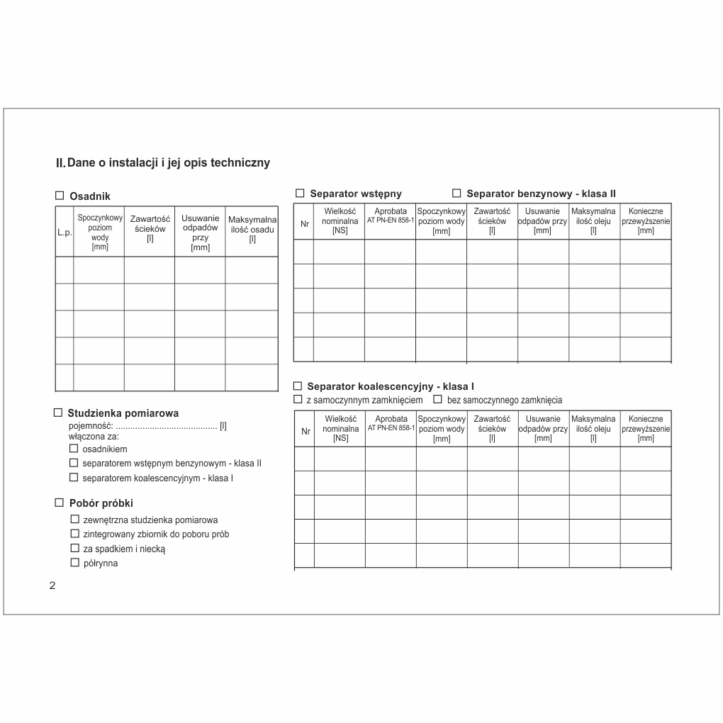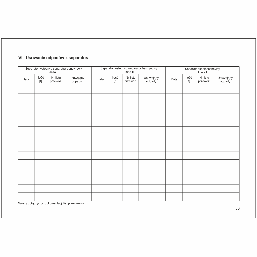 - Adnotacje o przeprowadzonych naprawach, czynnościach serwisowych oraz szkoleniach obsługi separatora.