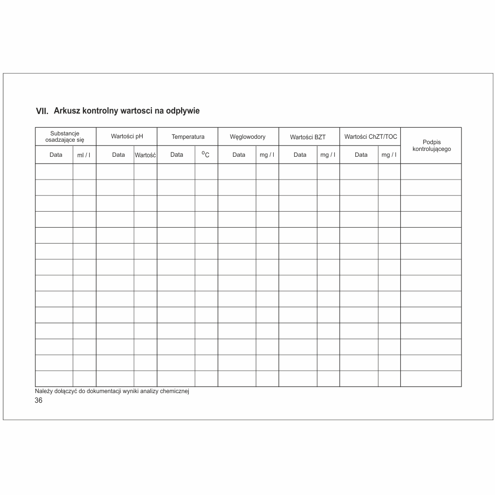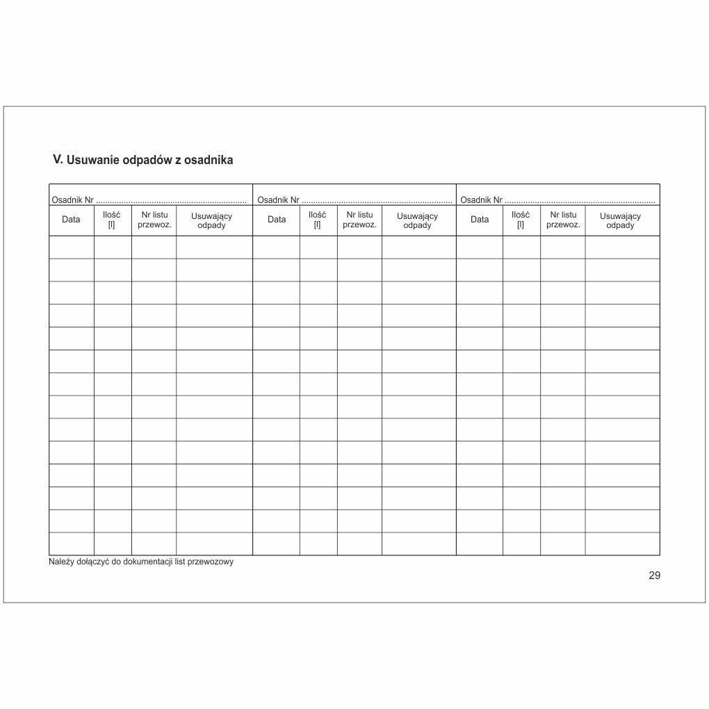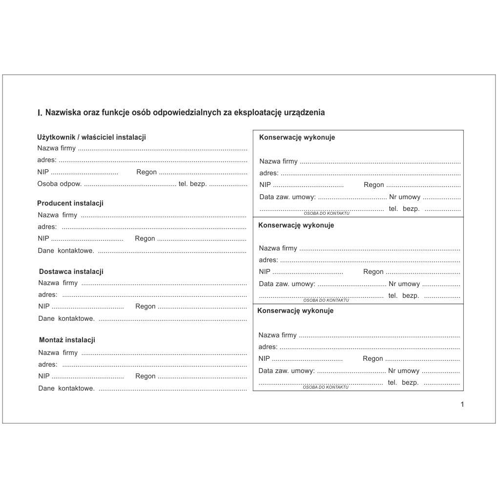 - Adnotacje o przeprowadzonych naprawach, czynnościach serwisowych oraz szkoleniach obsługi separatora.