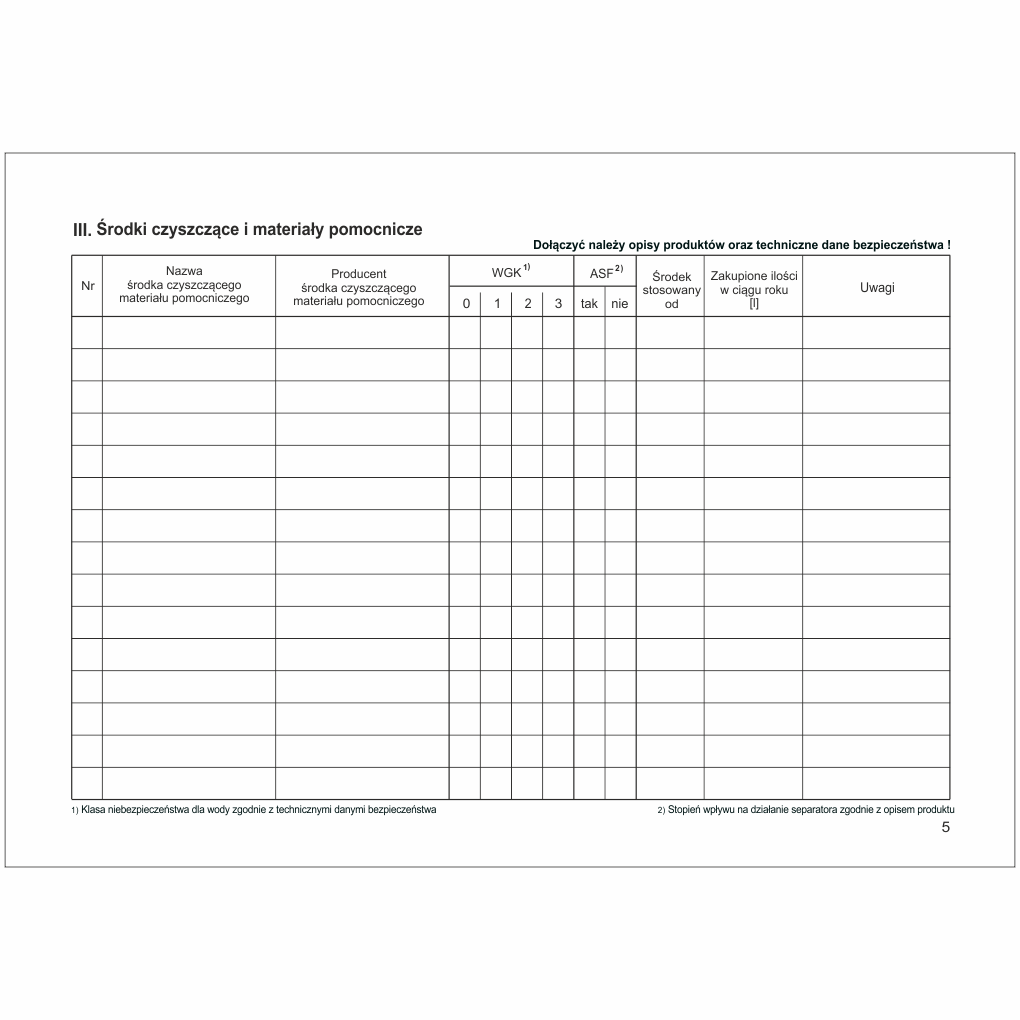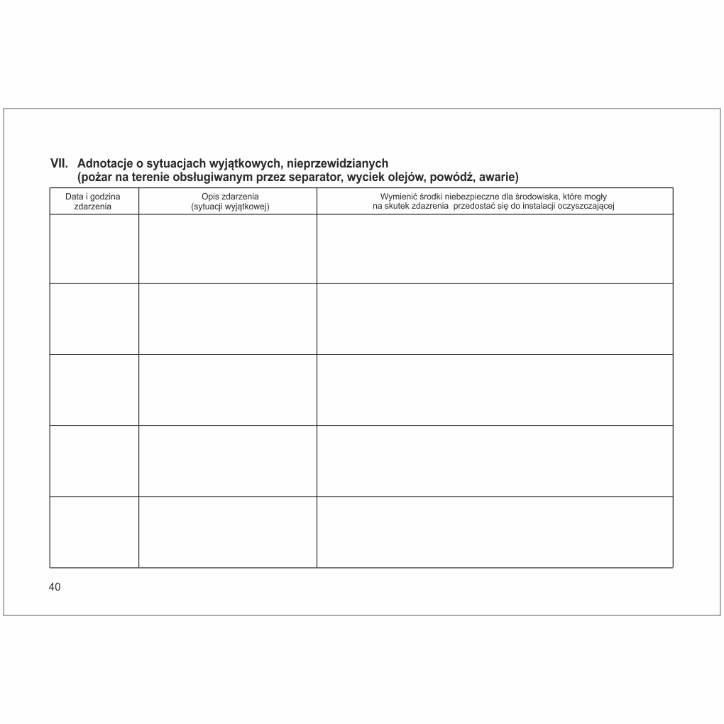 - Adnotacje o sytuacjach wyjątkowych, nieprzewidzianych (pożar na terenie obsługiwanym przez separator, wyciek olejów, powódź, awarie).