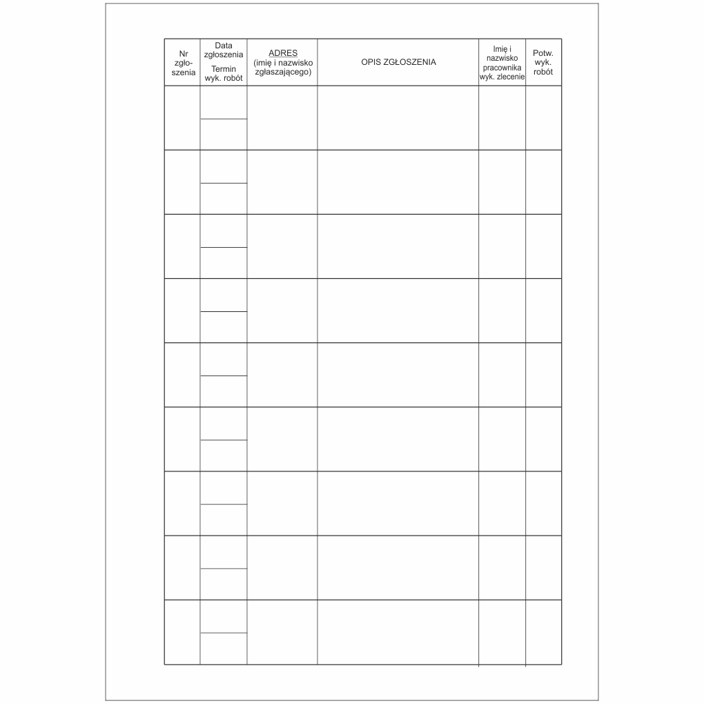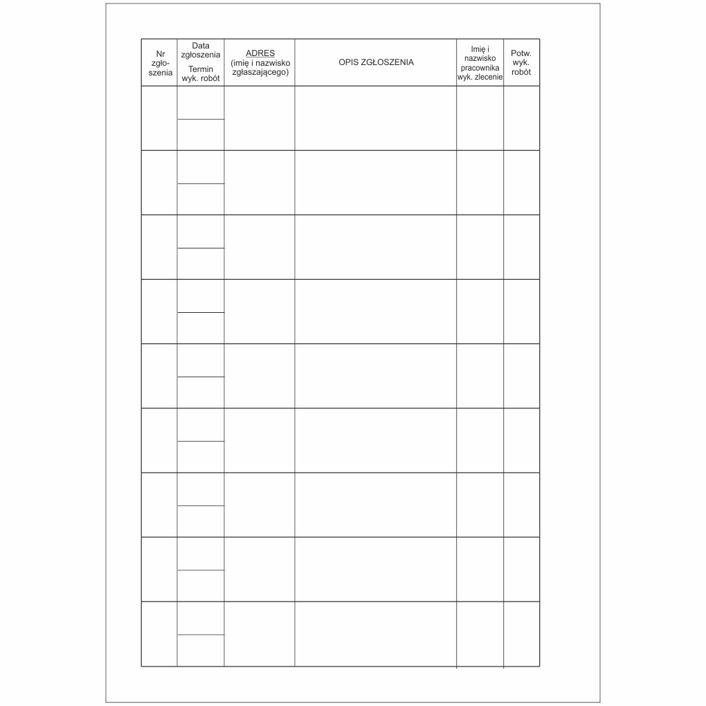 przeznaczony do rejestracji przyjmowanych zgłoszeń usterek i awarii w administrowanych zasobach. Dziennik jest wykonany w formie księgi A4 o objętości 80 kartek, oprawa twarda standard.