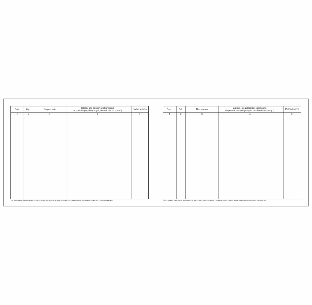 wymiary 420 x 148 mm (2 x A5), papier offsetowy biały 80 g/m, nadruk 2-stronny w kolorze czarnym. karta przeznaczona do złożenia na pół, do kolejnych wpisów można stosować wkładki Mz/St-1a. Nasza karta posiada wymagane prawem oświadczenie pacjenta o udostępnianiu informacji o stanie jego zdrowia oraz upoważnienie do przekazania dokumentacji medycznej na wypadek śmierci pacjenta.