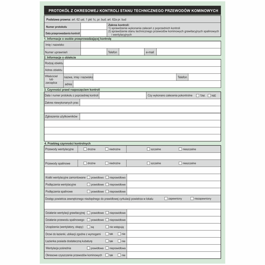 W jednym pliku przekazujemy komplet dokumentów niezbędnych do przeprowadzenia kontroli okresowej przewodów kominowych po nowelizacjach przepisów budowlanych w 2023 roku. Zgodnie z obowiązującym porządkiem prawnym wszystkie 3 dokumenty są wymagane do prawidłowego przeprowadzenia kontroli okresowej. Plik jest w formie aktywnego formularza PDF i można wypełnić na komputerze, następnie wydrukować i podpisać. Nie musimy wpisywać kilka razy tych samych danych, gdyż formularz został tak zaprojektowany, aby dane wpisane do umowy powielały się automatycznie w protokole i rachunku.
