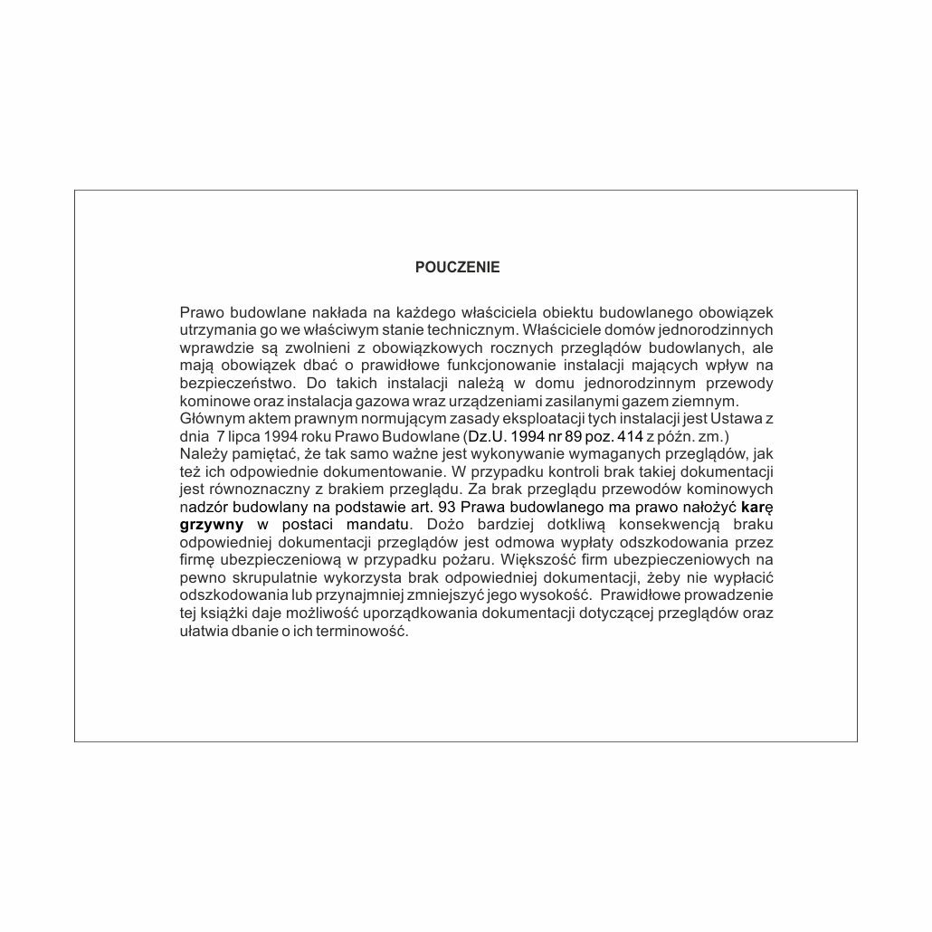 Prawo budowlane nakłada na każdego właściciela obiektu budowlanego obowiązek utrzymania go w należytym stanie technicznym.Właściciele domów jednorodzinnych są zwolnieni z obowiązkowych rocznych przeglądów budowlanych, ale mają obowiązek dbać o prawidłowe funkcjonowanie instalacji mających wpływ na bezpieczeństwo. Do takich instalacji nalezą przewody kominowe oraz instalacja gazowa wraz z odbiornikami gazu. Należy pamiętać, że tak samo ważne jak samo wykonanie wymaganych przeglądów jest ich prawidłowe udokumentowanie.