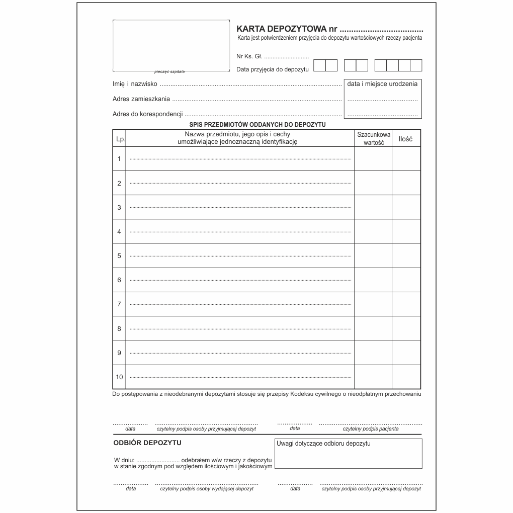 Księga depozytowa składa się z kopii kart depozytowych, oryginały po wypełnieniu i opatrzeniu podpisami należy wyrwać i oddać pacjentowi.