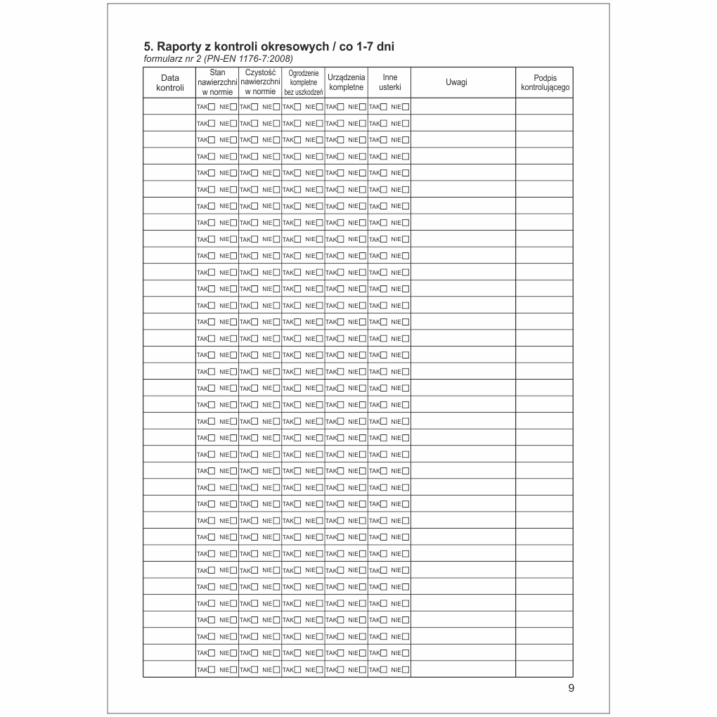 Aby wymienione wyżej urządzenia utrzymać w należytym stanie technicznym i użytkowym zarządca nieruchomości ma obowiązek wykonywania bieżących napraw i remontów oraz poddawania ich kontroli pod względem bezpieczeństwa użytkowania. Obowiązek ten wiąże się koniecznością dokumentowania odpowiednich czynności i zdarzeń zaistniałych na placu zabaw i do tego celu służy oferowana przez nas księga placu zabaw.