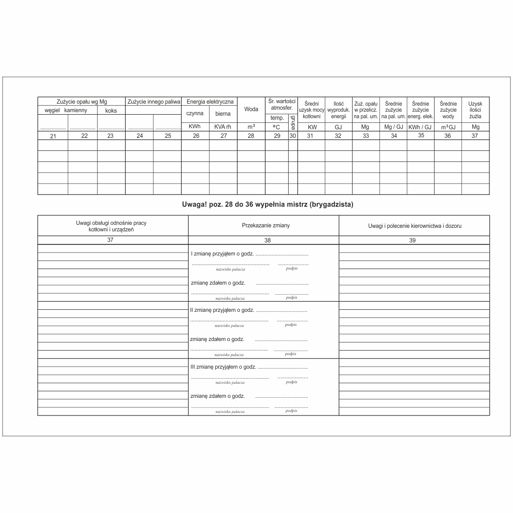 - Przekazanie zmiany - [godz przyjęcie / nazwisko palacza, podpis - godzina zdania / nazwisko palacza, podpis]