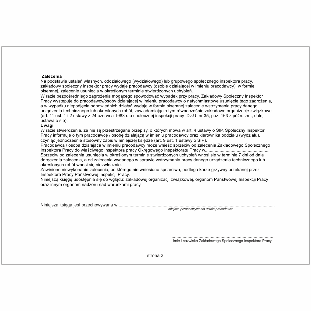 - Adnotacje Społecznego Inspektora Pracy lub innego organu kontroli o wykonaniu zalecenia uwagi.