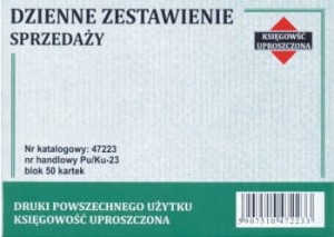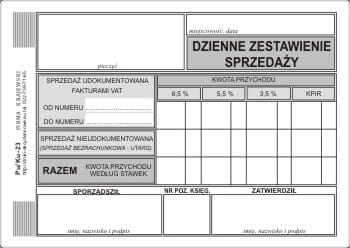 Przedmiotem transakcji jest 1 blok druku dzienne zestawienie sprzedaży. Druk ten jest przeznaczony do ewidencjonowania przychodów udokumentowanych oraz nieudokumentowanych w ciągu 1 dnia, z rozbiciem na stawki opodatkowania podatkiem ryczałtowym