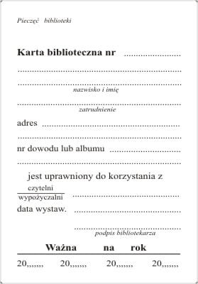 Przedmiotem transakcji jest druk Karta biblioteczna wykonana z białego kartonu offsetowego o gramaturze 250 g, wymiary 105 x 74 mm, nadruk czarny, 2 - stronny.