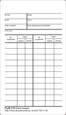 Przedmiotem transakcji jest druk Karta książki wykonana z białego kartonu offsetowego o gramaturze 250 g, wymiary 75 x 130 mm, nadruk czarny, 2 - stronny.