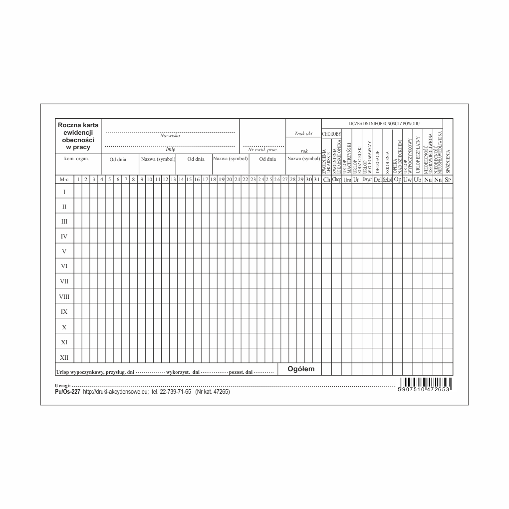Roczna karta ewidencji obecności w pracy [Pu/Os-227]