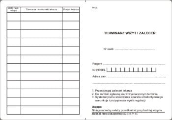 Przedmiotem transakcji jest kartonowa mini książeczka, która zwiera dane pacjenta oraz tabelkę z datami kolejnych umówionych wizyt, zaleceniami lekarza oraz podpisami lekarza.