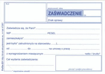 Przedmiotem tej transakcji jest druk Zaświadczenie o zatrudnieniu i zarobkach. Druk jest wydawany pracownikowi, przez pracodawcę celem przedłożenia w banku, urzędzie, szkole itp. Poświadcza na nim pracodawca, że dana osoba jest u niego zatrudniona na okreslony rodzaj umowy oraz poświadcza wysokość jego wynagrodzenia netto lub brutto. Druk jest wykonany na papierze samokopiującym, oryginał - kolor biały, kopia - kolor żółty. Druki są sklejone w blok o objętości 80 kartek (40 kpl).