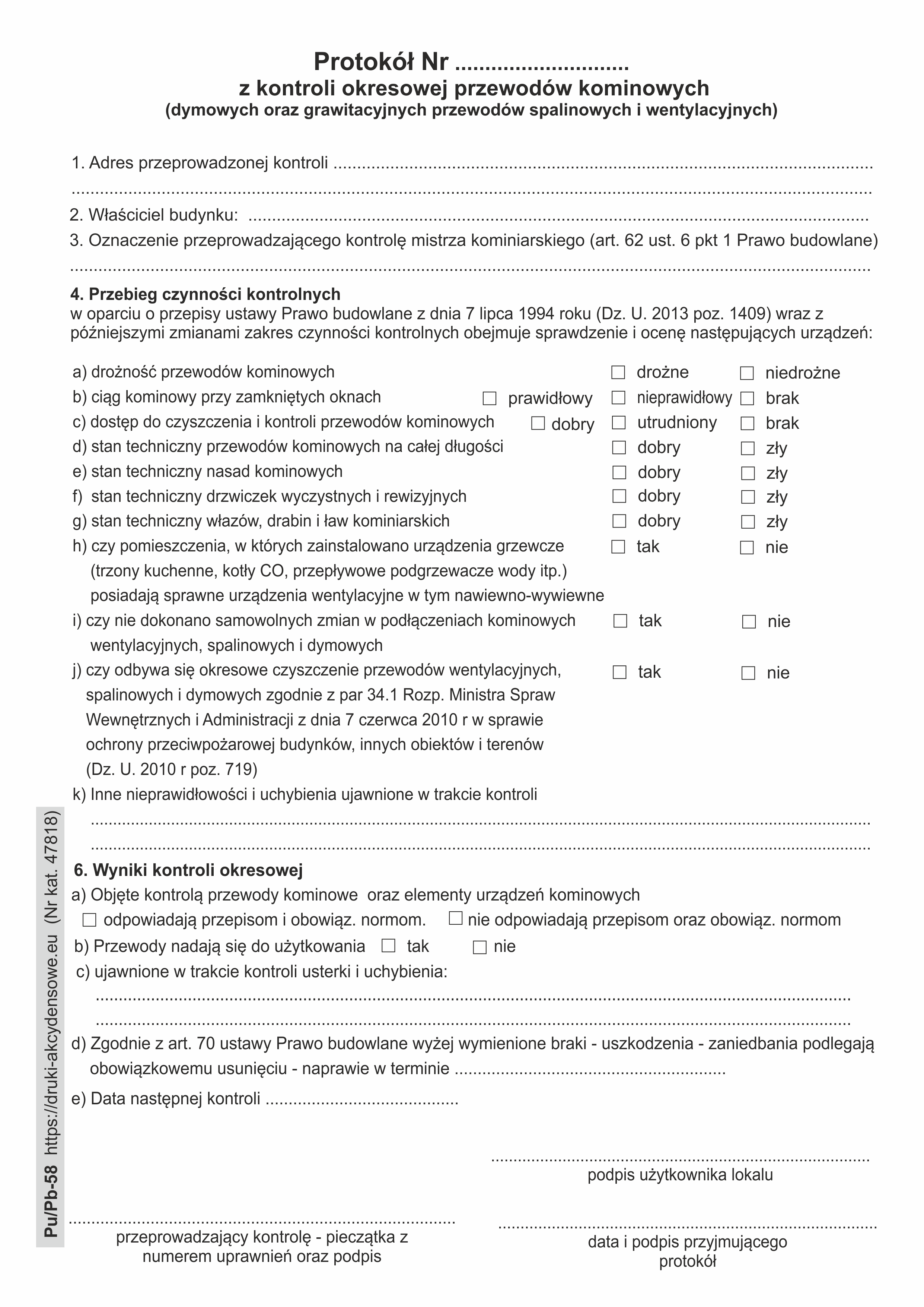 Druk uniwersalny, nadaje się równie dobrze do domku jednorodzinnego, jak też do budynku wielolokalowego. Powyższy akt prawny narzuca obowiązek wykonania przeglądu na wszystkich raz do roku, a w przypadku gdy używamy przewodów kominowych do palenia paliwem stałym - 4 razy w roku. Protokół jest podstawowym dokumentem potwierdzającym wykonanie kontroli.