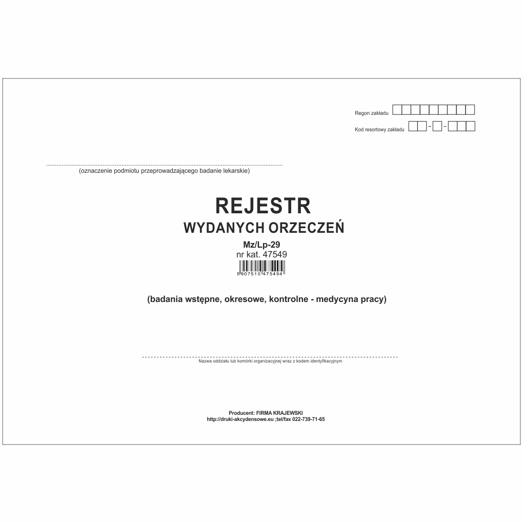 Rejestr wydanych orzeczeń lekarskich - Kodeks Pracy [Mz/Lp-29]