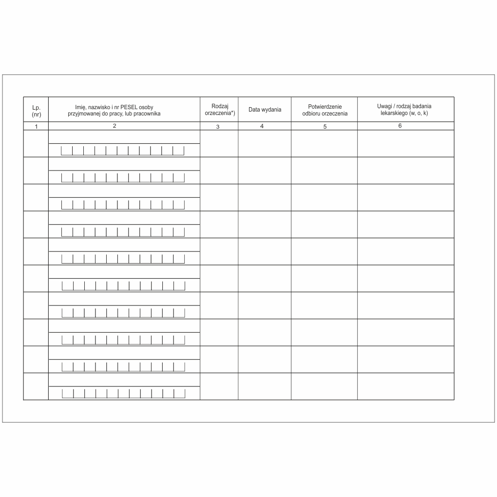 - Uwagi, rodzaj badania lekarskiego (w, o, k)