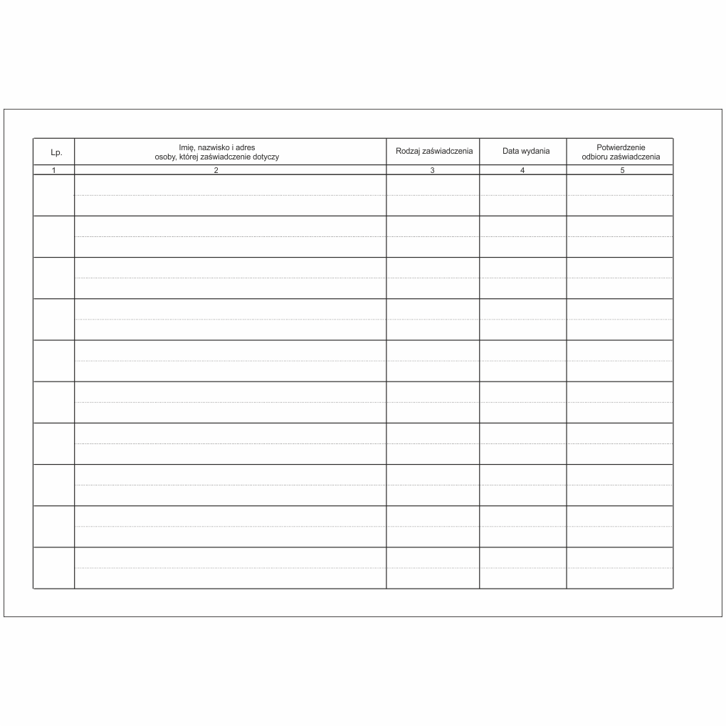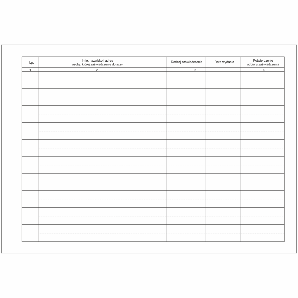 Księga jest przeznaczona do ewidencjonowania w porządku chronologicznym wydanych zaświadczeń przez jednostkę organizacyjną oraz potwierdzenia ich odbioru przez zainteresowanych.