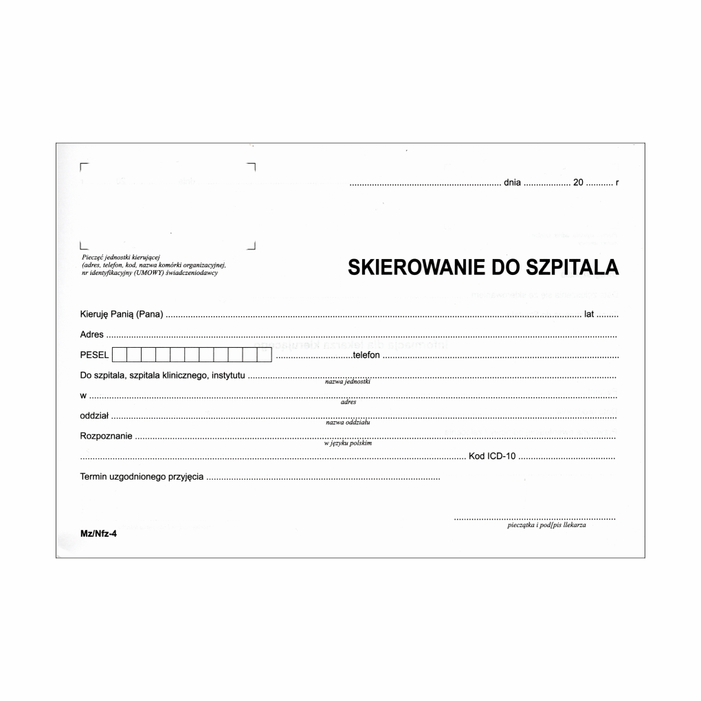 Druk zgodny z wymogami NFZ, przeznaczony do skierowania pacjenta do szpitala w celu dalszego leczenia