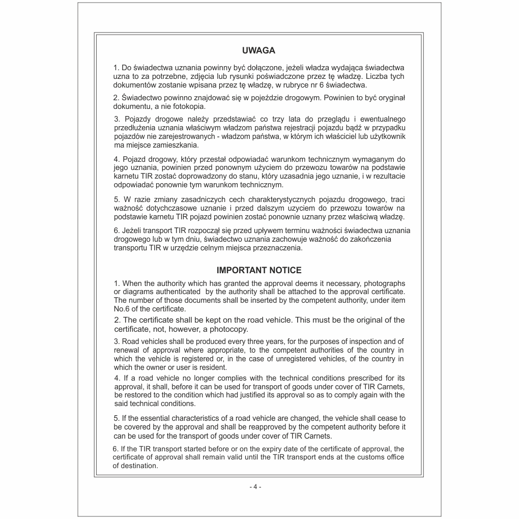 druk dla firm transportowych przewożących ładunki poza granicami Polski, z użyciem karnetu T.I.R. Świadectwo jest wystawiane dla każdego pojazdu oddzielnie. Świadectwo wydaje urząd celny właściwy dla miejsca zarejestrowania pojazdu i jest ono ważne przez 2 lata. Uznanie traci ważność wcześniej gdy w pojedzie zaistnieją zmiany zasadniczych cech użytkowych. Świadectwo powinno znajdować się w pojeździe i jest ono głównym dokumentem uprawniającym właściciela pojazdu do zamocowania na nim tablic "T.I.R.".