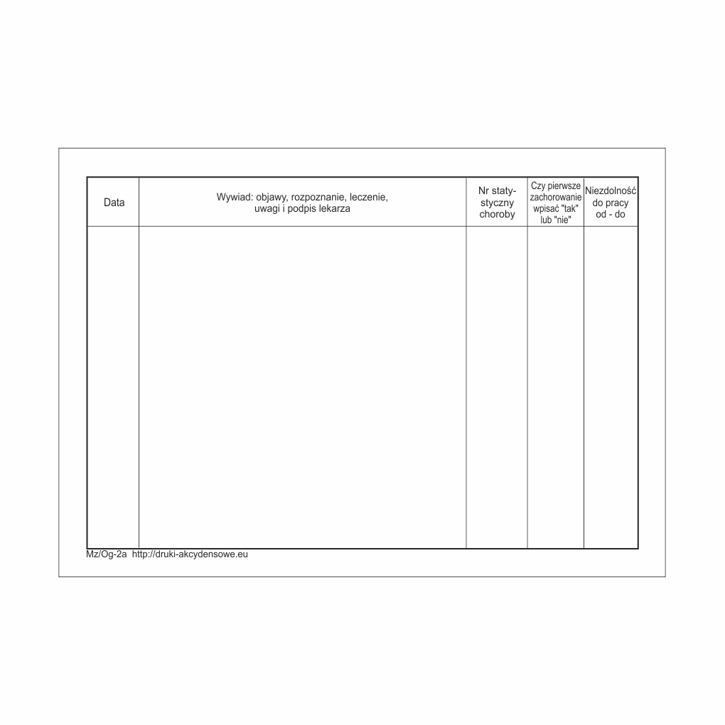 Druk można stosować do historii choroby Mz/Og-2, jako uzupełnienie stron, przy kolejnych wizytach pacjenta i wpisach. Na każdej stronie wkładki należy napisać imię i nazwisko pacjenta, wypełnioną wkładkę należy przechowywać razem z historią choroby danego pacjenta,