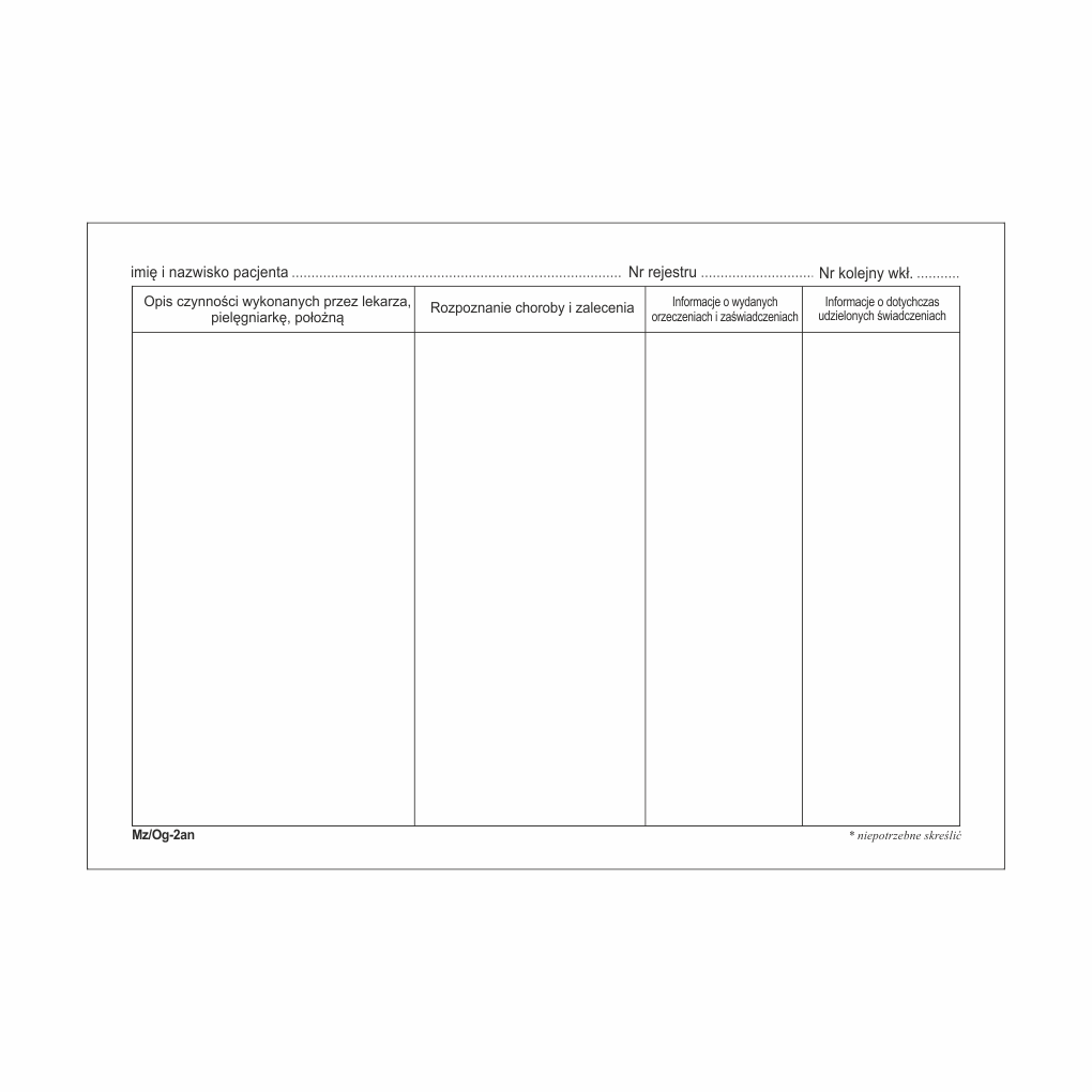 Można go stosować do historii zdrowia i choroby Mz/Og-2n, jako uzupełnienie stron, przy kolejnych wizytach pacjenta i wpisach. Na każdej stronie wkładki należy napisać imię i nazwisko pacjenta, wypełnioną wkładkę należy przechowywać razem z historią choroby danego pacjenta.
